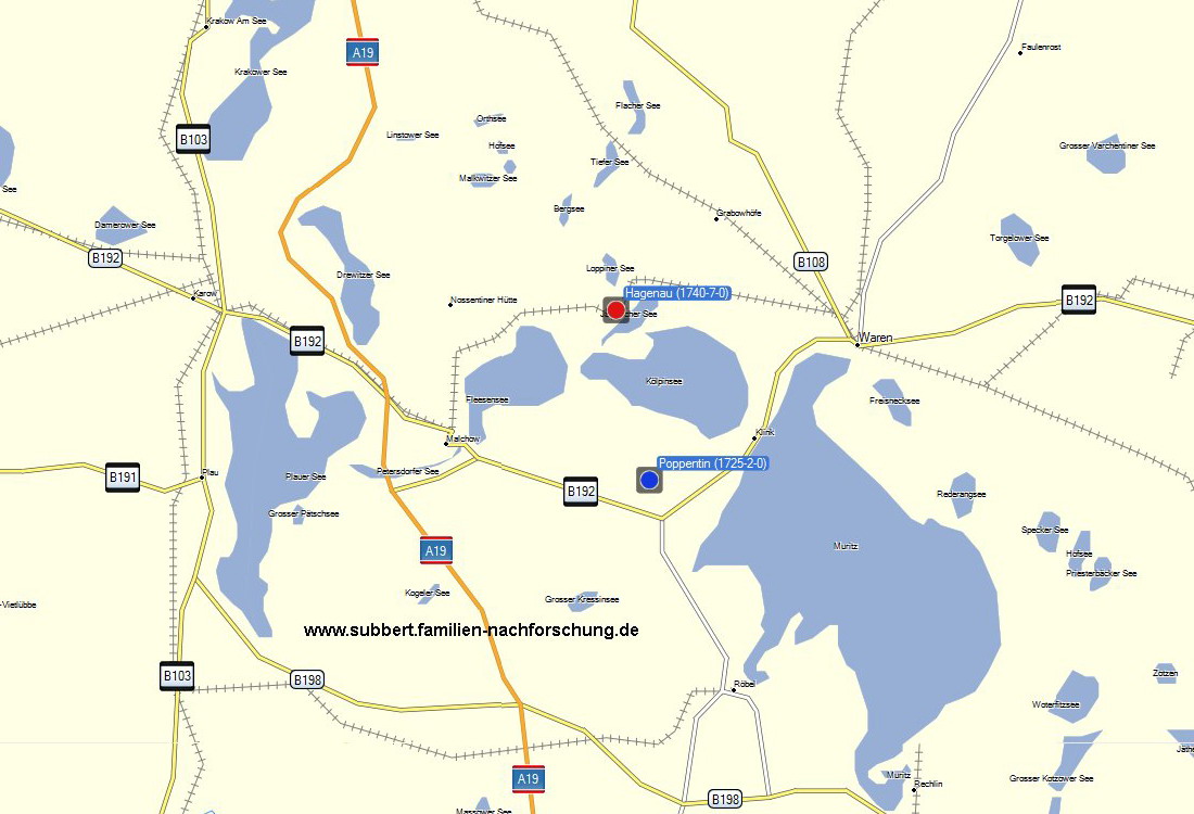 | Schwerpunkt-Region Raum Waren, in der seit 1725 Geburten und/oder Sterbefälle der Familie Subbert erkannt worden sind |
